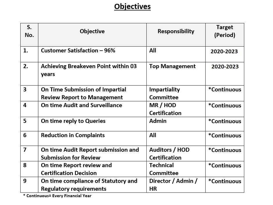 - Offering impartial and competent national & international certification services in accordance with ISO/IEC 17021-1:2015, ISO/IEC TS 17021-3:2017, ISO/IEC 27006:2015, ISO/IEC 27006-2:2021 & ISO/TS 22003:2013 to all who wish to avail our services.